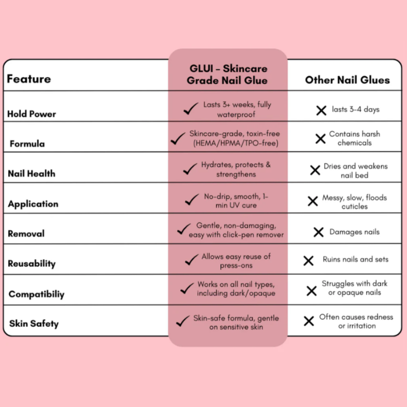 Unlike traditional glues that use harsh chemicals like cyanoacrylate (which can burn and damage nails), GLUI is made with hydrating ingredients that protect your natural nails and cuticles.